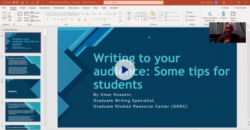 Writing to Your Audience: Professional and Research writing (e.g. thesis, dissertation, journal article)