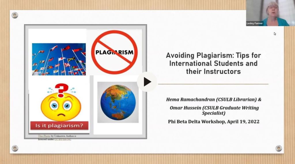 In April 2022, I collaborated with the wonderful Hema Ramachandran to produce a workshop on plagiarism for CSULB’s Phi Beta Delta honor society, which was chaired by our gracious workshop host, Dr. Lesley Farmer. The video of the workshop is available below. While the workshop was geared toward international students, most of the advice is relevant to all students.